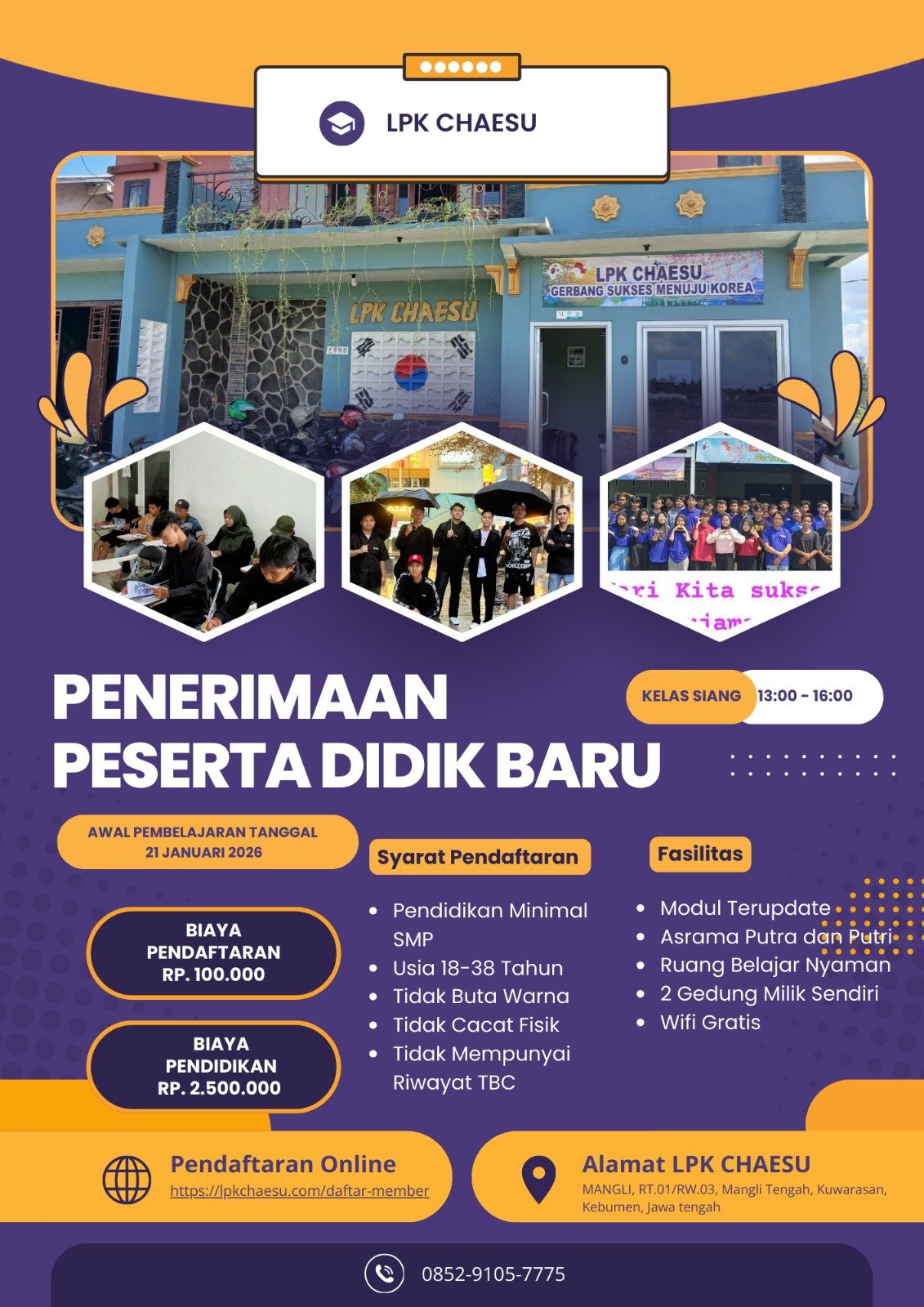 LPK CHAESU adalah lembaga pendidikan bahasa Korea khusus program G to G Korea. LPK CHAESU hadir untuk menjawab tantangan zaman tentang dunia kerja khususnya ke luar negri.